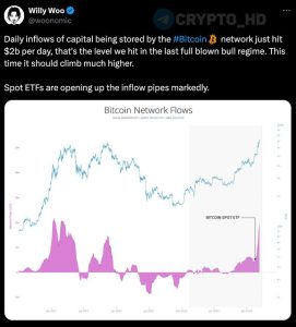 Como resultado direto das entradas massivas nos ETFs Bitcoin e de uma corrida de touros de apoio, as entradas diárias de capital armazenado pela rede Bitcoin atingiram apenas 2 mil milhões de dólares por dia, marcando mais um marco para o ecossistema.