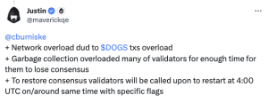 Em uma postagem, o membro da TON Foundation, Justin, disse que a interrupção foi o resultado de uma sobrecarga de rede devido ao alto número de transações DOGS. Ele também observou que os validadores da TON ficaram sobrecarregados, fazendo com que perdessem o consenso.