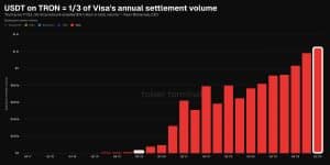 As liquidações de USDT na rede Tron aumentaram para cerca de um terço do volume total de liquidações da gigante de pagamentos Visa no segundo trimestre comercial de 2024, respondendo por incríveis US$1,25 trilhão em liquidações de transações na rede.