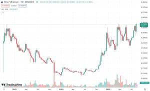 A relação Solana (SOL) para Ether (ETH) atingiu uma nova máxima de 0,0595, de acordo com dados do TradingView.
