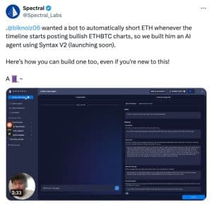 Em uma postagem, a Spectral Labs disse que havia construído um agente de inteligência artificial para vender Ether automaticamente sempre que os traders de criptomoedas começassem a postar gráficos otimistas de ETH/BTC — uma métrica que mostra o valor de um token Ether em relação a um Bitcoin (BTC).