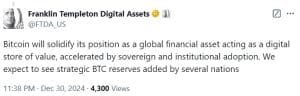 A Franklin Templeton, uma grande provedora de fundos negociados em bolsa (ETF), previu que se tornará prática para vários países usarem Bitcoin em ativos de reserva estratégica até 2025.
