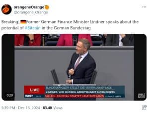 Christian Lindner, ex-ministro das finanças da Alemanha e líder do FDP, questionou o atual governo alemão em não capitalizar as chances criadas pelas tecnologias criptográficas. Lindner acredita que a Alemanha está falhando em aproveitar a oportunidade econômica e a segurança financeira nacional que o Bitcoin poderia fornecer. Ele faz uma analogia com os EUA, que é um exemplo de um país que tomou medidas promovendo medidas favoráveis às criptomoedas, e argumenta que a Alemanha também deve implementar tais medidas se quiser garantir seu futuro financeiro.