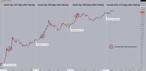 Após o halving de 2024, o Bitcoin atingiu uma nova máxima histórica acima de US$109.000 em janeiro de 2024, aproximadamente 273 dias após o halving. Essa rápida ascensão contrasta com os 546 dias necessários para atingir um marco semelhante após o halving de 2021, sugerindo um ciclo de mercado acelerado. Analistas atribuem essa aceleração ao maior envolvimento institucional e ao crescente reconhecimento do Bitcoin como reserva de valor.