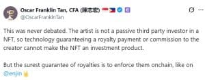 Oscar Franklin Tan, especialista jurídico e diretor jurídico da Atlas Development Services, principal colaboradora da Enjin, apoiou a posição de Peirce. Em entrevista, Tan ressaltou que os royalties servem como renda para o criador e não como esquemas de participação nos lucros com investidores passivos.