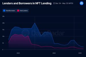 O declínio não se limita apenas ao volume. A atividade dos tomadores de empréstimo caiu 90% desde janeiro de 2024, enquanto o número de credores ativos caiu 78%. Além disso, o valor médio dos empréstimos NFT diminuiu de US$22.000 em 2022 para apenas US$4.000 em maio de 2025 — uma queda de 71%. Isso sugere que os usuários estão tomando empréstimos com ativos de menor valor ou simplesmente estão mais cautelosos ao usar alavancagem.