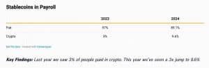O relatório, baseado em uma pesquisa com mais de 1.600 profissionais de criptomoedas em 77 países, constatou que as stablecoins são a escolha predominante para a folha de pagamento de criptomoedas. Especificamente, a USDC da Circle e a USDT da Tether respondem por mais de 90% desses pagamentos. Curiosamente, a USDC lidera com 63% da participação, embora a USDT seja a stablecoin mais negociada globalmente em volume.