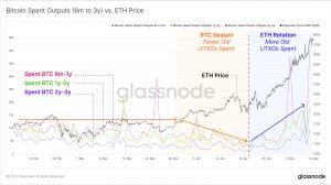 Glassnode correlacionou o comportamento de gasto de saídas de transações não gastas de Bitcoin razoavelmente antigas entre 6 meses e 3 anos, encontrando evidências de que investidores de longo prazo poderiam ter recentemente entrado em ETH: