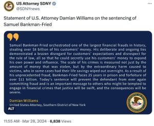 “O juiz Kaplan pesou todos os fatores de condenação, incluindo a magnitude do crime, sua conclusão de que SBF mentiu no banco das testemunhas e adulterou uma testemunha, e proferiu uma sentença grave. Embora seja inferior ao pedido dos promotores por 40-50 anos, é uma sentença muito significativa e envia uma mensagem de que as pessoas condenadas por crimes no espaço criptográfico enfrentarão sérias consequências.”