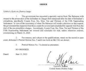 A divisão das acusações ocorre quando os promotores do DOJ solicitaram uma renúncia às autoridades das Bahamas para julgar Bankman-Fried pelas cinco acusações adicionais impostas após sua extradição do país.