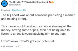 Alguns membros da comunidade já estão comparando o possível conteúdo do filme com outros filmes. Um membro da comunidade acha que o filme pode ser outro ‘Lobo de Wall Street’, mas com pessoas nojentas e feias, enquanto outro disse que só seria assistível se Bankman-Fried mencionasse alguns nomes e todos caíssem. Enquanto isso, um usuário do Twitter acredita que não tem o mesmo potencial que ‘The Big Short’. Eles escreveram: