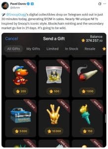 Esta nova série de NFTs, batizada de “Telegram Gifts“, é inspirada no estilo único de Snoop Dogg e apresenta uma variedade de itens digitais animados, incluindo carros antigos, sacolas de brindes, cachorros digitais e símbolos relacionados à maconha, entre outros. Esses tokens foram projetados para serem usados como imagens de perfil animadas ou convertidos na moeda do aplicativo da plataforma, chamada Stars, adicionando uma camada de interatividade e utilidade que vai além dos meros itens colecionáveis.
