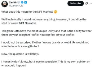 O que diferencia os Telegram Gifts é sua utilidade distinta — a possibilidade de os usuários usarem esses NFTs em seus perfis. Esse recurso cria uma dimensão social e pessoal para os tokens, potencialmente aumentando seu apelo e utilidade em comparação com itens colecionáveis padrão. Zenith sugeriu ainda que outras marcas proeminentes ou propriedades intelectuais da Web3 podem se inspirar para lançar coleções semelhantes de presentes NFT no Telegram, embora ainda não se saiba se isso acontecerá.