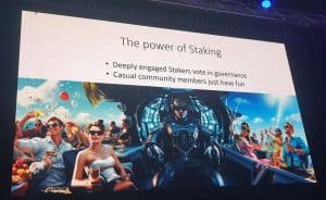 A dupla discutiu uma apresentação do sócio da Castle Island Ventures, Nic Carter, na conferência, na qual ele disse que stablecoins que rendem juros poderiam se tornar 30% do mercado dentro de dois anos.