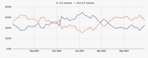 Em junho de 2023, cerca de 55% dos fluxos de stablecoins para os 50 principais serviços iam para exchanges não licenciadas nos EUA.