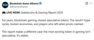 As stablecoins estão se tornando, discretamente, a infraestrutura financeira essencial para o mercado global de jogos, avaliado em US$ 350 bilhões, indo muito além de seu uso original como simples ferramentas de pagamento. De acordo com um novo relatório da BLOCKCHAIN GAMING ALLIANCE (BGA), os desenvolvedores estão adotando cada vez mais ativos atrelados a moedas fiduciárias, como USDT e USDC, como o “sistema operacional monetário” para impulsionar suas economias dentro dos jogos, remunerar criadores e reter jogadores.