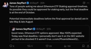 O analista da Bloomberg Intelligence, James Seyffart, indicou que a Comissão de Valores Mobiliários (SEC) dos EUA pode aprovar funcionalidades de staking para ETFs de Ether já em maio de 2025. Embora essa previsão seja otimista, Seyffart também sugere que uma decisão final pode se estender até outubro de 2025, com prazos intermediários no final de maio e agosto.