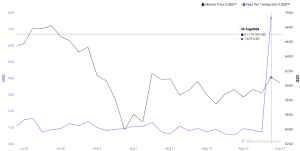 A taxa média de transação do Bitcoin aumentou 937,7% de US$0,74 para US$7,679 por transação, impulsionada principalmente pelo aumento da demanda da rede.
