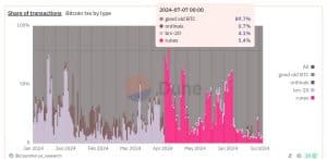 Os mineradores de Bitcoin processaram 673.752 transações na rede Bitcoin, de acordo com dados do Ycharts. O BTC representou 89,7% das transações, e o restante da largura de banda foi ocupado por outros protocolos, como Ordinals (0,7%), BRC-20 (4,1%) e Runes (5,4%).