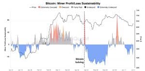 O relatório da CryptoQuant também observou que os mineradores foram extremamente mal pagos, conforme evidenciado pelo indicador de sustentabilidade de lucros/perdas dos mineradores durante a maior parte do período desde o halving, conforme mostrado abaixo.