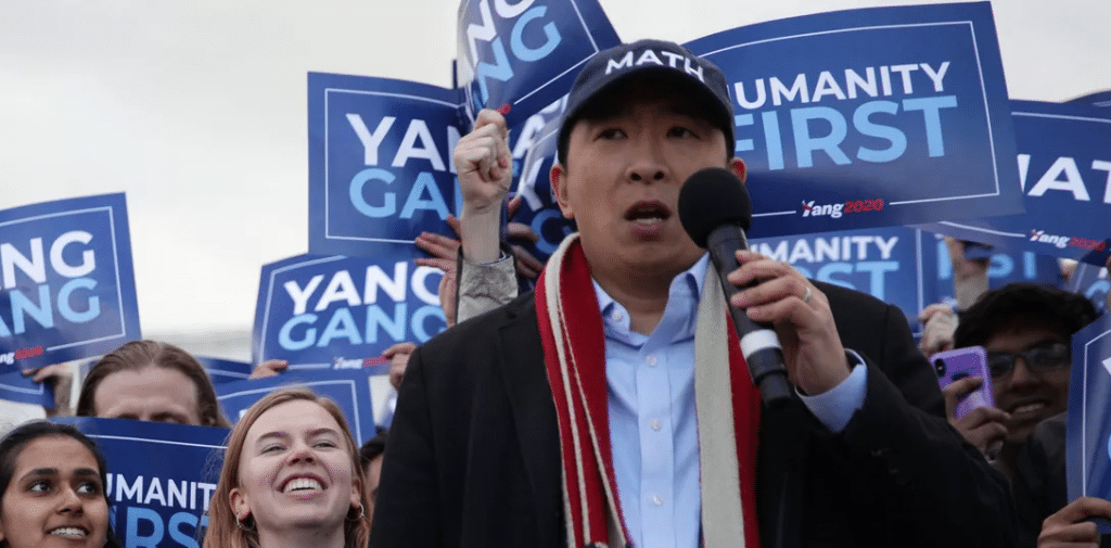 Yang é um empreendedor de sucesso que fundou uma organização chamada Venture for America, uma bolsa empresarial. Ele é autor de um livro chamado “A Guerra contra as Pessoas Normais”, que argumenta em favor de uma renda básica universal de US$ 1.000 por mês para todos os adultos dos EUA. Ele também se opõe à inteligência artificial e à tecnologia de automação.