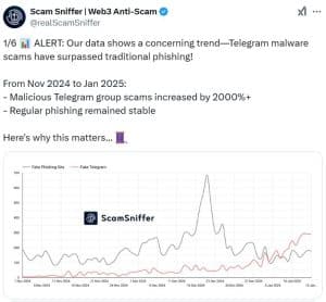 O fenômeno da aceitação de criptomoedas não só gerou inovação em sistemas financeiros, mas também criou novos alvos para criminosos cibernéticos. No entanto, uma rápida mudança no modus operandi dos golpes entrou em vigor recentemente. O Telegram, uma plataforma de mensagens popular, se tornou o epicentro de golpes sofisticados de criptomoedas. A empresa de segurança Scam Sniffer descobriu um aumento de 2.000% em golpes de malware baseados no Telegram desde novembro de 2024 e o malware utilizado na plataforma se tornou o tipo mais comum de ataque de malwaresuperando em número os ataques de phishing. Esses golpes não são mais apenas para enganar os usuários a transferir suas carteiras para sites maliciosos, mas também se estendem à infecção com malware usando bots do Telegram disfarçados.