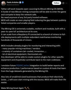 Paolo Ardoino, CTO da Tether e CEO da Bitfinex, revelou esse plano em uma publicação recente, destacando como a iniciativa pode estimular uma participação mais ampla na mineração de Bitcoin e fortalecer a segurança da rede.
