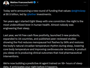 A empresa de stablecoins TETHER liderou uma rodada estratégica de investimento de US$ 50 milhões na startup de tecnologia do sono EIGHT SLEEP, avaliando a companhia em cerca de US$ 1,5 bilhão. A gigante das stablecoins está ampliando sua atuação muito além do universo cripto.
