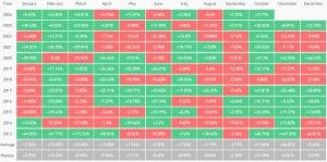 Outubro é historicamente o segundo melhor mês para o preço do Bitcoin, com retornos médios de 21%, atrás de novembro, que tem uma média de mais de 46% de retornos mensais para o Bitcoin, de acordo com dados da CoinGlass.