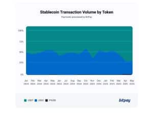A mudança foi ainda mais pronunciada em termos de volume de transações: desde março de 2025, o USDT processou mais de 70% dos pagamentos com stablecoins no BitPay — uma reversão completa em relação ao ano anterior.
