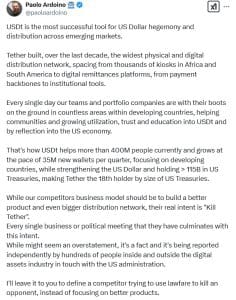 Ardoino destacou que, embora os rivais da Tether devam se concentrar em criar produtos melhores e expandir suas redes de distribuição, seu objetivo real parece ser a eliminação do Tether do ecossistema de criptomoedas. Em uma publicação no X (antigo Twitter), ele declarou: