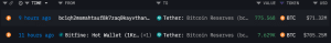 Conforme revelado pela empresa de análise de blockchain Arkham Intelligence, as carteiras de reserva de Bitcoin da Tether receberam dois depósitos distintos em 30 de dezembro. A transferência inicial foi de cerca de 7.628,9 BTC, e a segunda foi de cerca de 775,6 BTC. Juntas, essas transações totalizaram pouco menos de 8.404,5 BTC, o que é avaliado em US$777,4 milhões com base no preço do Bitcoin.