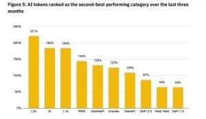 Para efeito de comparação, os tokens DeFi 2.0 tiveram um aumento de 87%, GameFi 109% e os tokens Real World Asset (RWA) um aumento de 145%. A única categoria que apresentou melhores retornos do que os tokens de IA foram os da camada 2, que tiveram um ganho de 221%. Os pesquisadores não incluíram memecoins em suas análises, alegando que essas moedas tiveram grandes ganhos de desempenho percentuais desproporcionais como resultado de sua capitalização de mercado relativamente mais baixa.