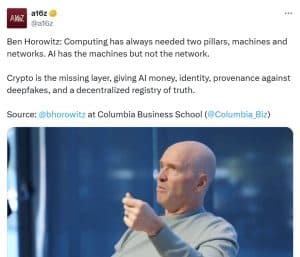 Além dos fluxos de capital de Wall Street, o segundo e indiscutivelmente mais revolucionário catalisador para um superciclo do Ethereum é o rápido avanço e adoção de protocolos de inteligência artificial agêntica. Pioneiros do setor, incluindo Ben Horowitz, cofundador da empresa de capital de risco Andreessen Horowitz (a16z), destacaram uma necessidade crítica que somente as criptomoedas podem suprir. Horowitz ressalta que: