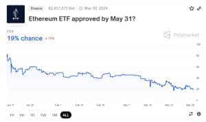 No momento, o custo de uma ação ‘Sim’ é de US$0,19, enquanto o ‘Não’ vale US$0,81, o que significa que menos jogadores acreditam nas chances de ETFs ETH à vista serem aprovados até o final de maio.