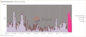 Runes representam a maior parte das transações em Bitcoin, respondendo por 68% de todas as transações de Bitcoin. Os investidores executaram um total de 3,6 milhões de transações relacionadas a Runes, de acordo com Dune.