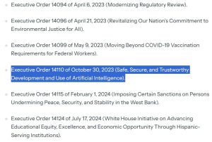 A ordem, assinada em outubro de 2023, forneceu um modelo granular para a regulamentação do desenvolvimento de IA. Exigiu que as corporações entregassem seus resultados de testes de segurança ao governo e promoveu o uso de diretrizes de privacidade e segurança para dispositivos de IA. De acordo com a administração Biden, essas ações foram justificadas com o objetivo de proteger os consumidores e responder às ameaças que os sistemas de IA cada vez mais sofisticados criam.