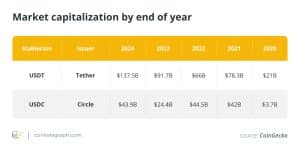 Em 2024, a capitalização de mercado do USDC aumentou de US$24,4 bilhões no início do ano para US$43,9 bilhões no final, representando um crescimento surpreendente de 79%.