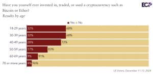 De acordo com a pesquisa, o uso de criptomoedas é bastante comum entre a geração mais jovem. Cerca de 33% dos eleitores jovens (menos de 40) usaram criptomoedas, o que é uma porcentagem muito maior do que a dos eleitores de faixas etárias mais velhas. Por outro lado, apenas 28% dos eleitores com 40 anos, 17% dos eleitores com 50 anos, 9% dos eleitores com 60 anos e apenas 4% dos eleitores com mais de 70 anos afirmaram usar criptomoedas. Esse padrão é consistente, de modo que a adoção de criptomoedas parece ser impulsionada principalmente por eleitores jovens e voltados para a tecnologia.