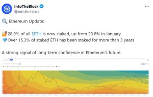 O IntoTheBlock também destacou que 15,3% do ETH apostado foi apostado por mais de três anos. O provedor de dados disse que este é um forte sinal de confiança de longo prazo no futuro do Ethereum.