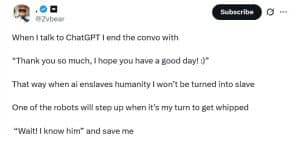 Esse comentário gerou discussões sobre os motivos pelos quais os usuários interagem com modelos de IA como o ChatGPT de maneira tão cortês. Alguns usuários, por exemplo, afirmam que estão sendo educados por receio de que a IA possa eventualmente se tornar senciente e tratar as pessoas de acordo com a forma como interagiram com ela no passado. Nessa visão, a polidez pode ser vista como uma forma de proteção para o futuro, garantindo um tratamento favorável caso a IA desenvolva consciência.