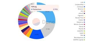 De acordo com dados da Dune Analytics, a participação de mercado da P2P.org em termos do total de Ether (ETH) apostado é de 0,75% ou 240.832 de ETH apostado.