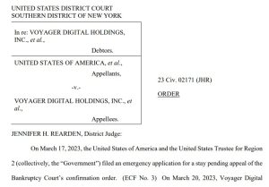O pedido de suspensão de emergência foi concedido pela juíza Jennifer Rearden, do Tribunal Distrital dos EUA em Nova York, o que significa que o possível acordo entre a Voyager e a Binance.US agora precisará esperar até que pelo menos uma decisão seja tomada no Departamento de Recurso da Justiça contra o plano de falência.