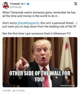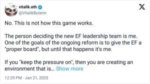 Após esse diálogo, Buterin reafirmou seu controle sobre as decisões da liderança. Ele explicou que a pressão da comunidade torna a tomada de decisões mais difícil e pode desmotivar os melhores talentos a se envolverem com a fundação.