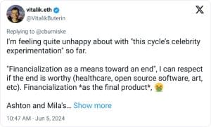 Buterin explicou que o projeto ‘Stoner Cats’ de Ashton Kutcher e Mila Kunis era muito mais respeitável do que qualquer coisa vista na tendência de memecoins de celebridades de 2024. Ele disse: