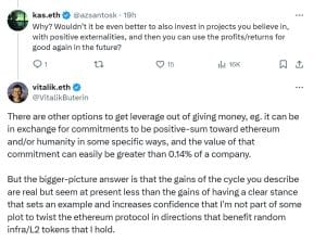 A resposta de Buterin reconheceu a observação de Santos, mas apresentou uma visão diferente sobre a ideia de lucros e retornos: