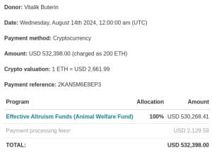 O recibo mostra que, Buterin enviou 200 Ether (ETH), no valor de US$532.398, para o fundo de caridade.