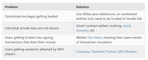 Ele observou que as exchanges descentralizadas forneceram uma solução para hacks em exchanges centralizadas, enquanto Cowswap, Flashbots Protect e MEV Blocker ajudaram a limitar a gravidade dos ataques sanduíche a usuários do Ethereum por exploradores de valor máximo extraível.