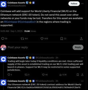 Enquanto isso, a Coinbase anunciou planos para listar o WLFI na rede Ethereum, mas esclareceu que a negociação só começaria quando houvesse liquidez suficiente.