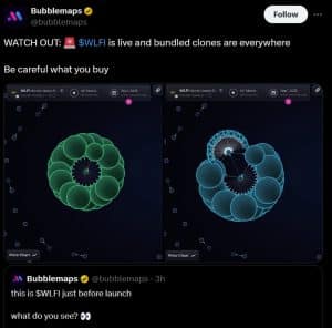 A empresa de análise Bubblemaps relatou a existência de “clones agrupados“, contratos inteligentes falsos projetados para se parecerem com os contratos oficiais da WLFI, mas que desviam fundos diretamente para agentes maliciosos.